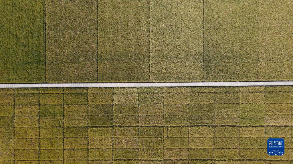 這是10月15日在牛角大圩水稻試驗示范基地拍攝的稻田。畫(huà)面上方為生產(chǎn)試驗階段的水稻,畫(huà)面下方為品種比較階段的水稻。