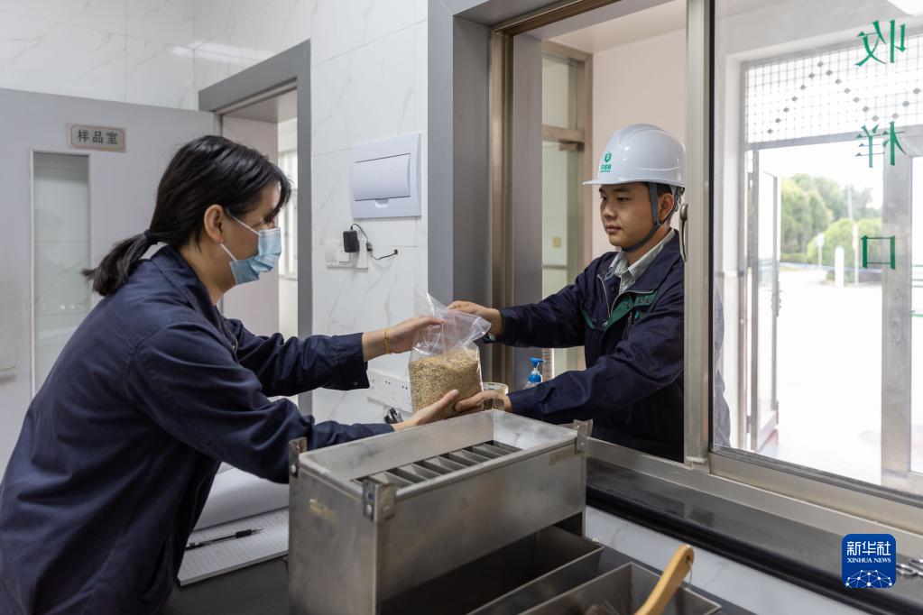 10月14日,在中央儲備糧上海直屬庫檢測中心,趙子龍將糧食樣品交給徐燁(左)進(jìn)行檢測。