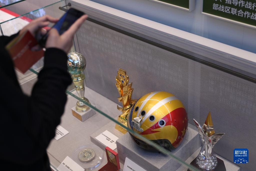觀(guān)眾在“奮進(jìn)新時(shí)代”主題成就展第八單元“堅持走中國特色強軍之路 全面推進(jìn)國防和軍隊現代化”展廳拍攝空軍特級飛行員蔣佳冀奪得的金頭盔(10月12日攝)。新華社記者 許雅楠 攝