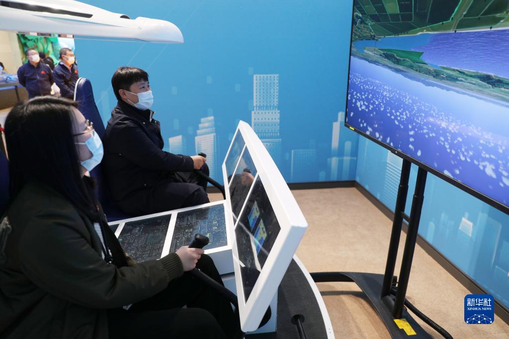 觀(guān)眾在“奮進(jìn)新時(shí)代”主題成就展第八單元“堅持走中國特色強軍之路 全面推進(jìn)國防和軍隊現代化”展廳體驗直升機綜合程序訓練器互動(dòng)體驗裝置(10月12日攝)。新華社記者 許雅楠 攝