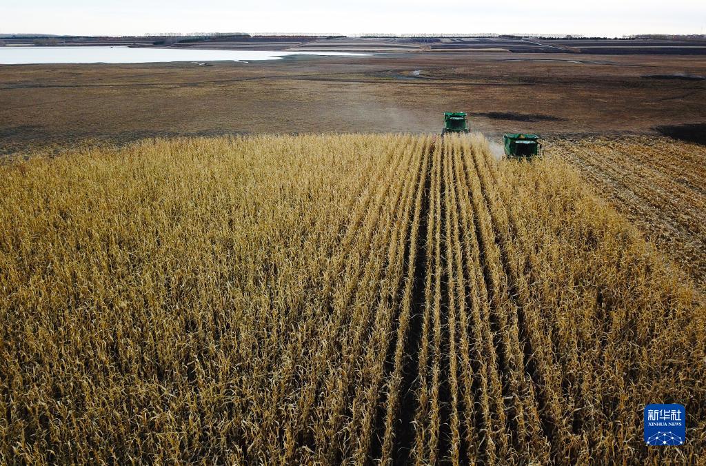 10月15日,在黑龍江省拜泉縣國富鎮自治村,農機在收獲玉米(無(wú)人機照片)。