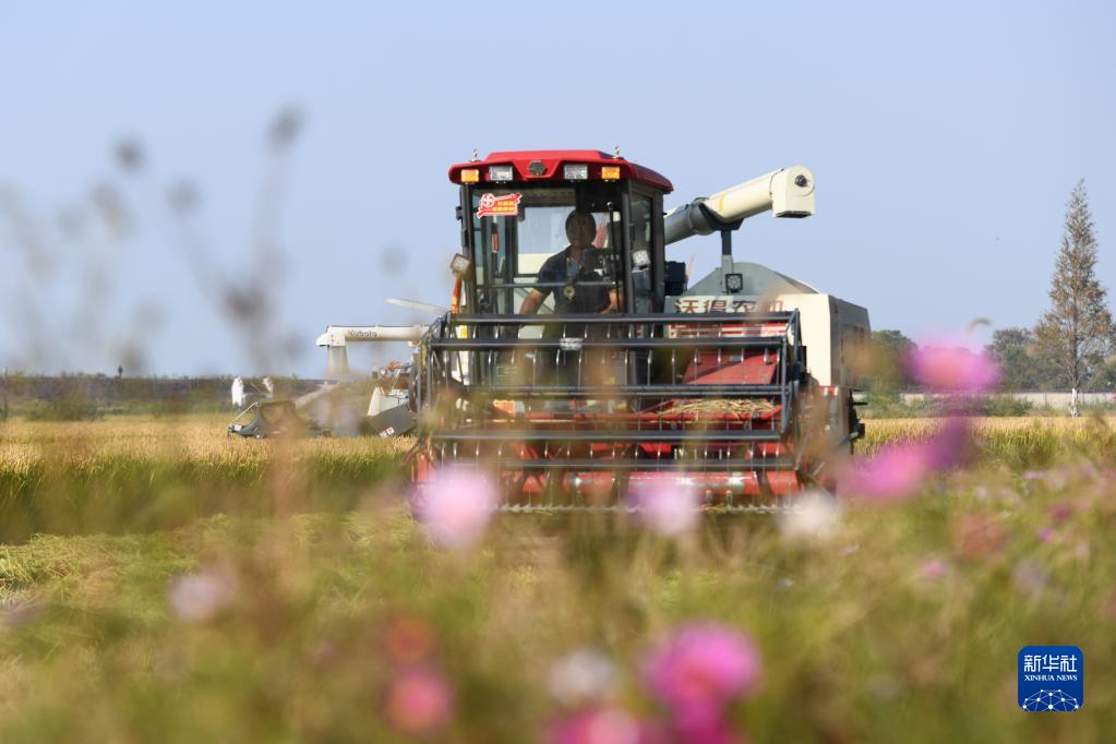 10月16日,在安徽省巢湖市槐林鎮,農機手操作收割機在田間收割水稻。