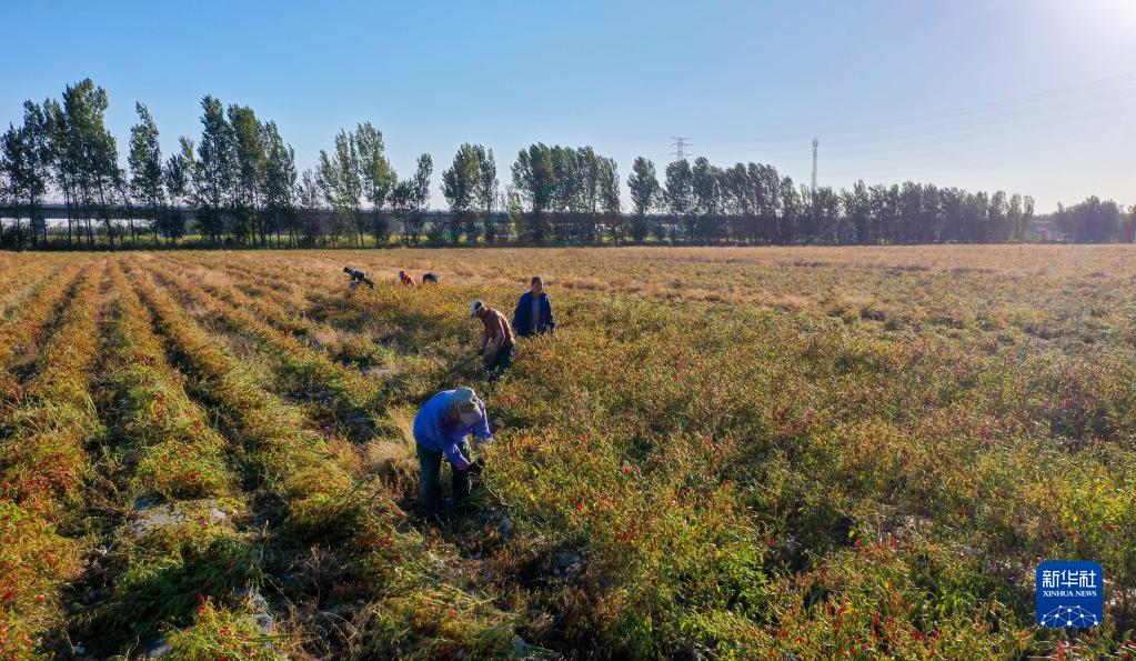 10月16日,在天津市寶坻區王卜莊鎮下王各莊村,村民在田間采收辣椒(無(wú)人機照片)。