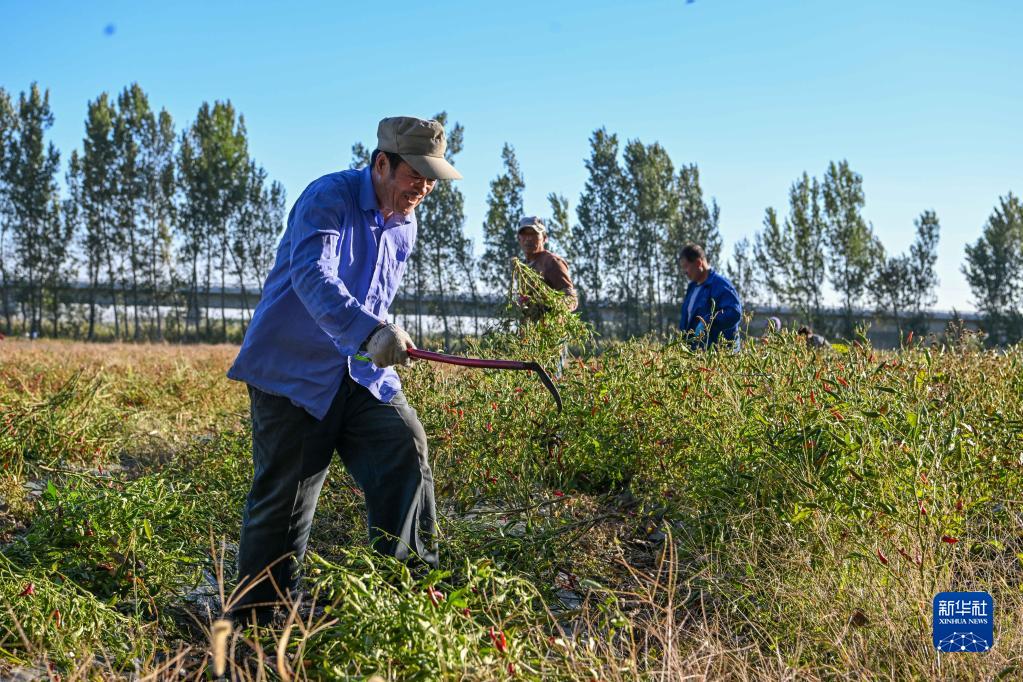 10月16日,在天津市寶坻區王卜莊鎮下王各莊村,村民在田間采收辣椒。 新華社記者 孫凡越 攝