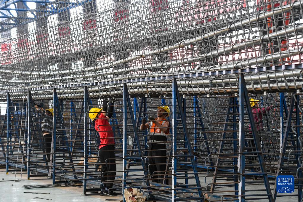 10月18日,工人在黃茅??绾Mǖ乐腔哿簣?chǎng)綁扎預制箱梁鋼筋籠。