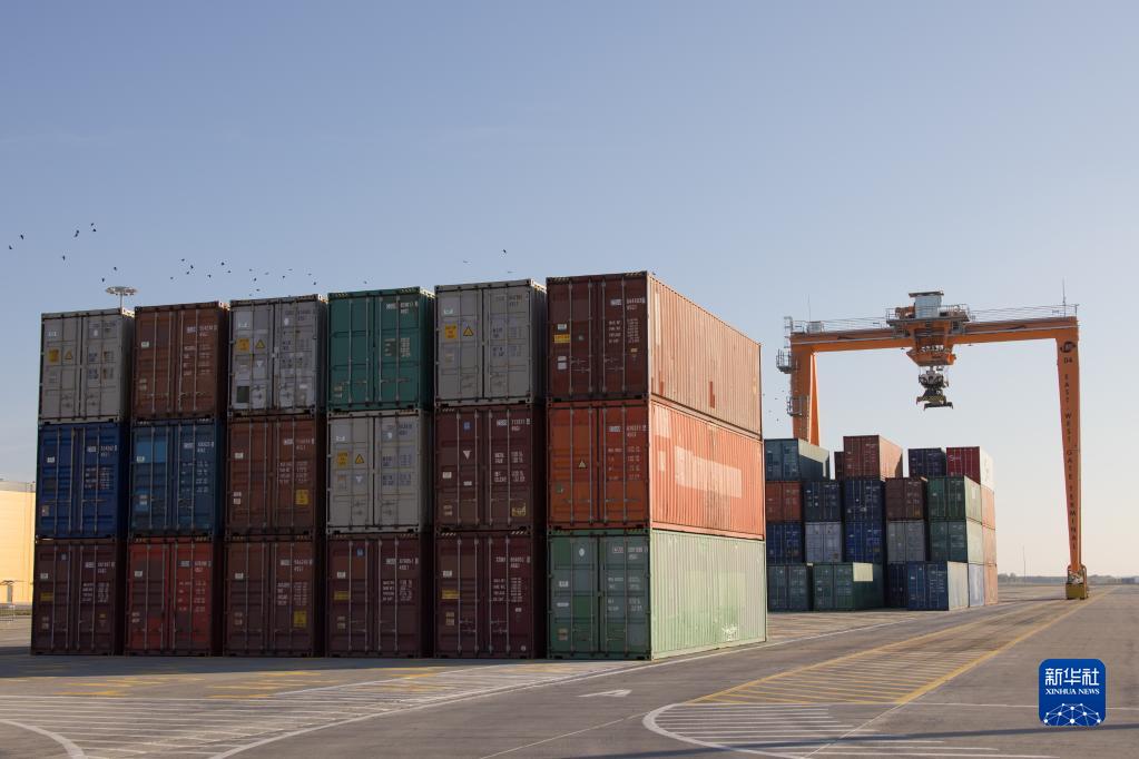 這是10月18日在匈牙利費涅什利特凱的東西門(mén)場(chǎng)站拍攝的集裝箱和由5G技術(shù)遠程控制的龍門(mén)起重機。