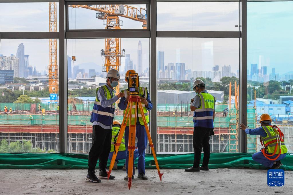 由中建深裝承建的央企中國電子總部大廈進(jìn)入幕墻同步安裝階段,技術(shù)人員在對首片弧面幕墻玻璃進(jìn)行放線(xiàn)測量(10月19日攝)。