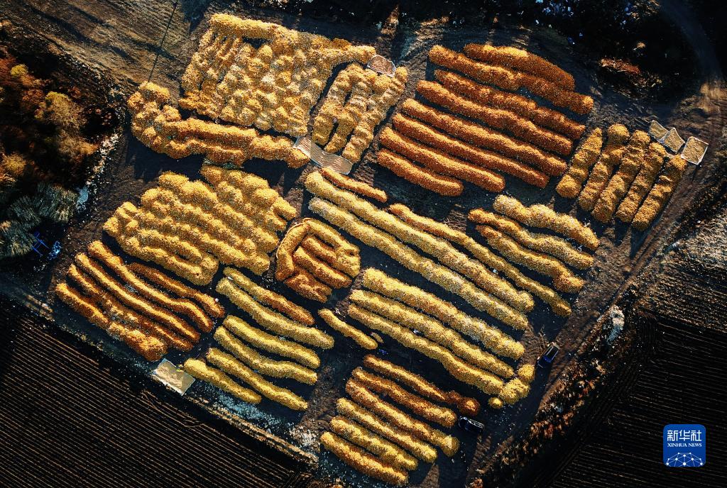 這是10月18日拍攝的黑龍江省拜泉縣三道鎮戰斗村一處曬場(chǎng)晾曬的玉米(無(wú)人機照片)。