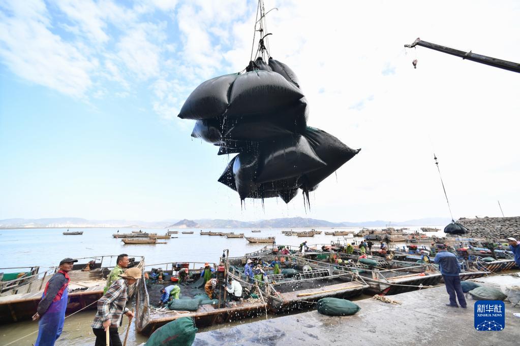 10月21日,工作人員在福建省霞浦縣松山街道沙塘街村碼頭吊運新收割的紫菜。