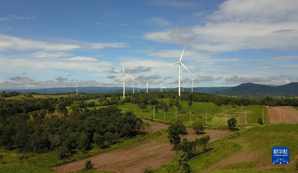 這是10月4日在泰國猜也蓬府拍攝的由中國金風(fēng)科技提供的風(fēng)力發(fā)電機(無(wú)人機照片)。