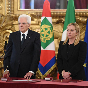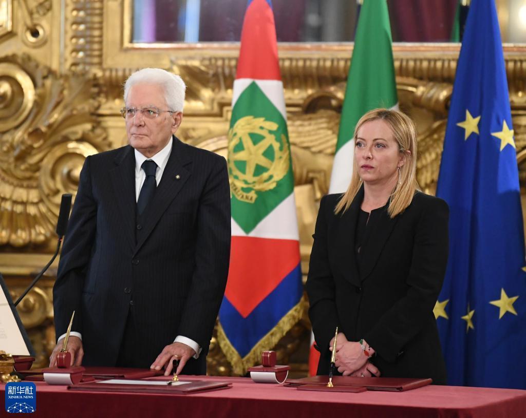 意大利新任政府總理焦爾吉婭·梅洛尼及其內閣成員22日在意總統府奎里納萊宮宣誓就職,梅洛尼由此成為意大利首位女總理。
