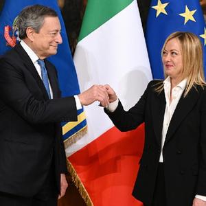 10月23日,在意大利羅馬,新任總理焦爾吉婭·梅洛尼(右)從前總理德拉吉手中接過(guò)主持內閣會(huì )議的鈴鐺。