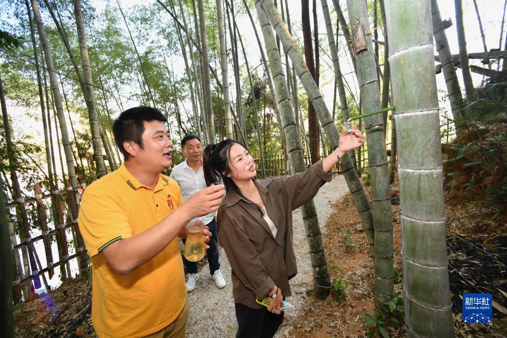 10月23日,在占西坑村竹酒生產(chǎn)基地,陳清(左)指導游客從竹節中取酒。