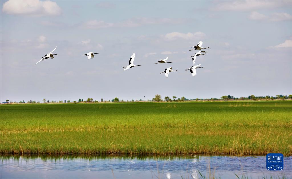 丹頂鶴在黑龍江扎龍國家級自然保護區自由翱翔(2020年5月19日攝)。 新華社發(fā)(宋燕軍 攝)