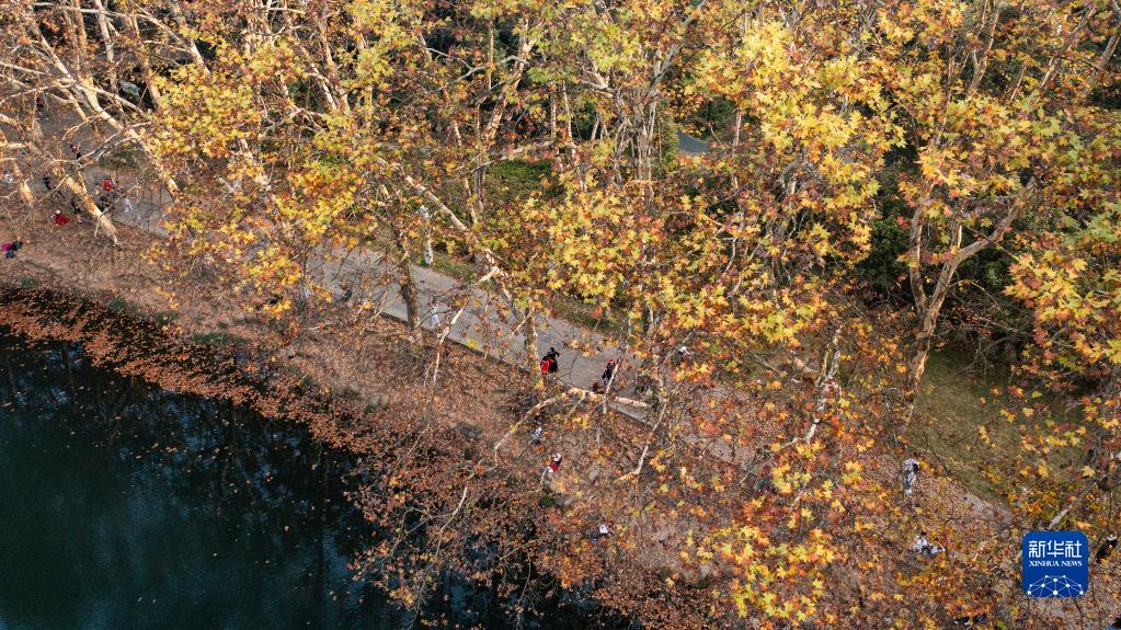 市民在貴陽(yáng)市花溪國家城市濕地公園黃金大道觀(guān)賞游玩(10月25日攝,無(wú)人機照片)。