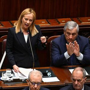 10月25日,意大利總理梅洛尼(中)在位于羅馬的眾議院發(fā)表講話(huà)。