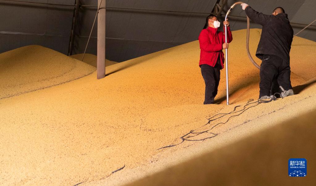 10月25日,在綏化市益盛糧食購銷(xiāo)有限公司內,工人進(jìn)行扦樣作業(yè),以此了解儲存倉內大豆水分、雜質(zhì)以及蟲(chóng)害等情況。