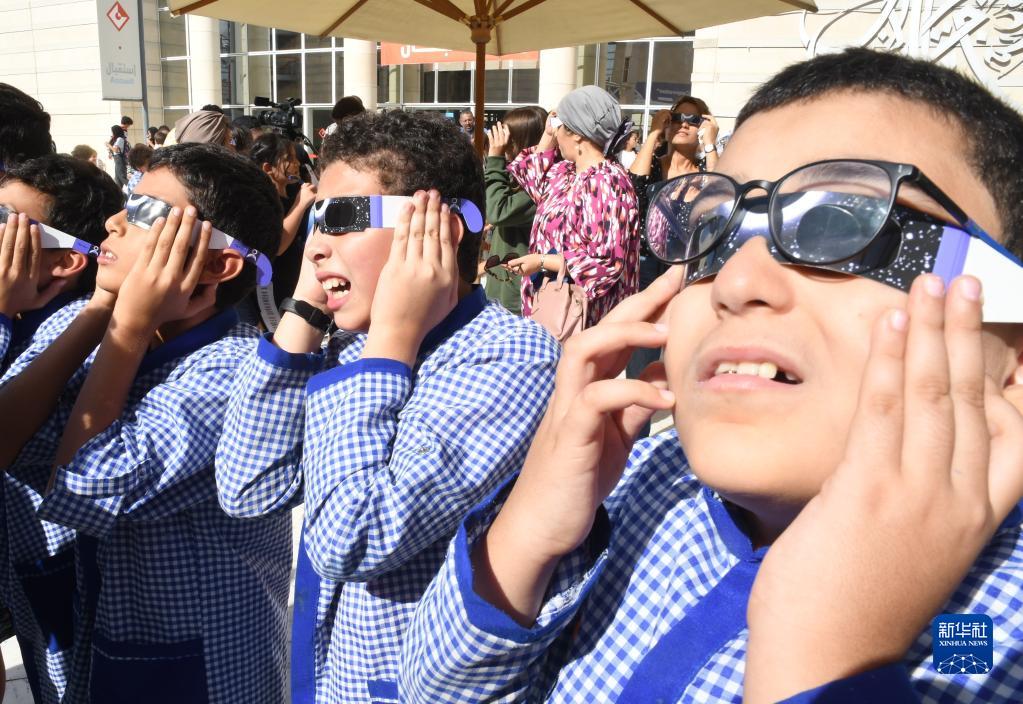 10月25日,突尼斯小學(xué)生戴著(zhù)特制墨鏡在突尼斯市觀(guān)看日偏食。