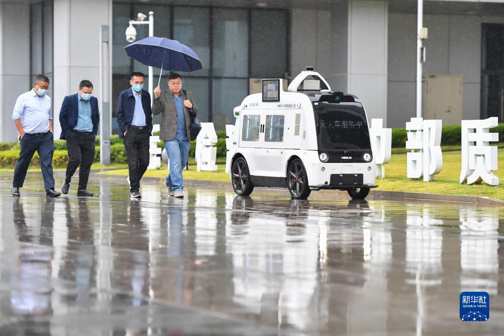 10月27日,在湖南湘江新區的湖南省檢驗檢測特色產(chǎn)業(yè)園內,無(wú)人駕駛零售車(chē)從行人旁邊經(jīng)過(guò)。