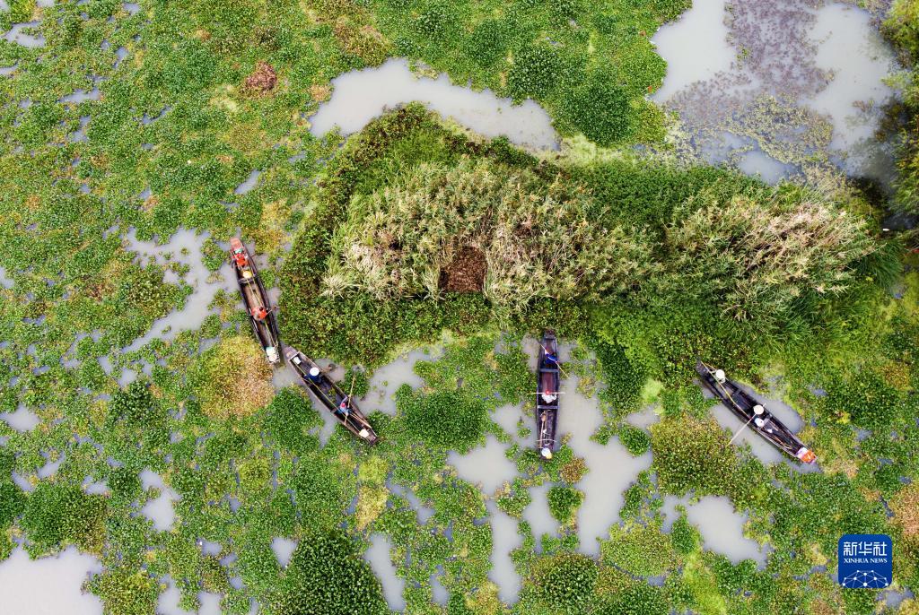 當日,浙江省湖州市吳興區水利部門(mén)組織作業(yè)人員對東林鎮東方村尚田港600畝水域的水葫蘆等入侵水生植物進(jìn)行打撈清運,打撈水葫蘆近千噸。