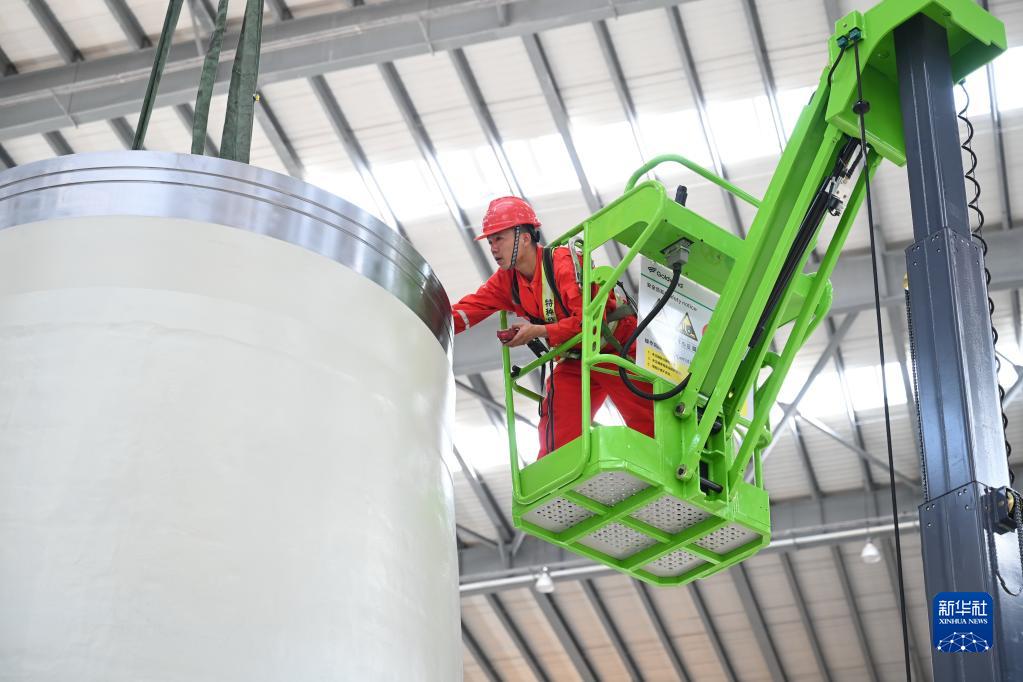 10月26日,福建金風(fēng)科技有限公司技術(shù)人員在風(fēng)電機組裝配車(chē)間作業(yè)。