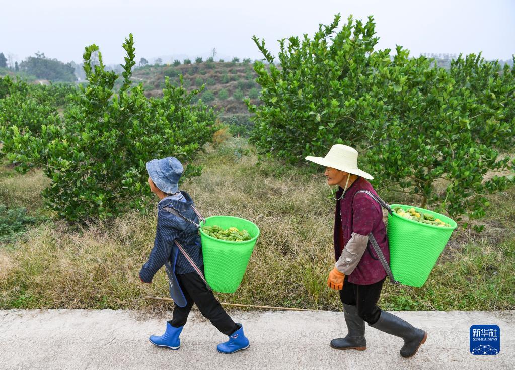10月27日,在重慶大足區金山鎮天河村,村民背運剛采摘的佛手。