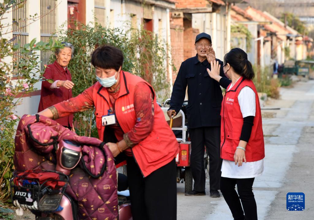 10月27日,在青島西海岸新區泊里鎮蟠龍李村,村民送別上門(mén)服務(wù)的養老服務(wù)中心工作人員。