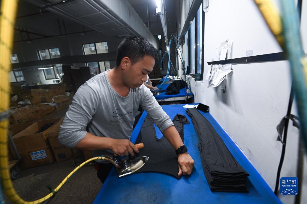 10月27日,在浙江省諸暨市大唐街道的一家企業(yè)車(chē)間內,工人在熨燙保暖褲襪。