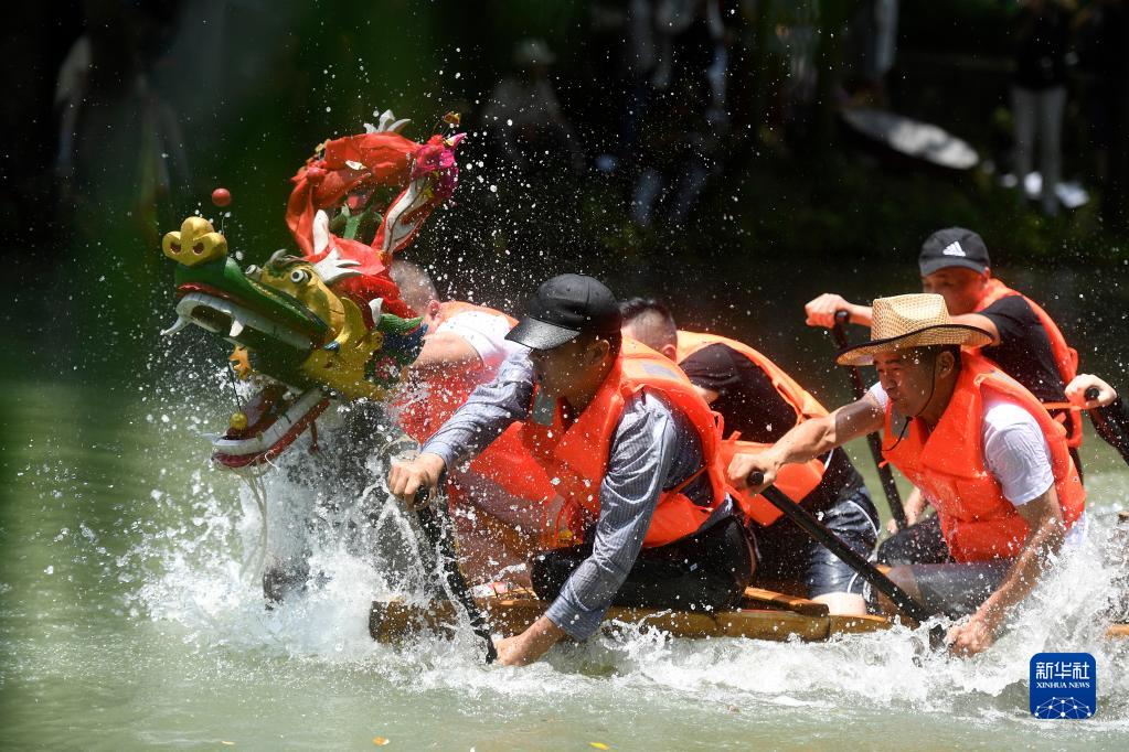 龍舟隊員在西溪濕地舉行的蔣村龍舟勝會(huì )上劃龍舟(2018年6月18日攝)。