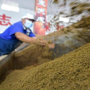 10月28日,在貴州省赤水市黔老翁醋廠(chǎng),工人在手工翻動(dòng)醋坯原料。