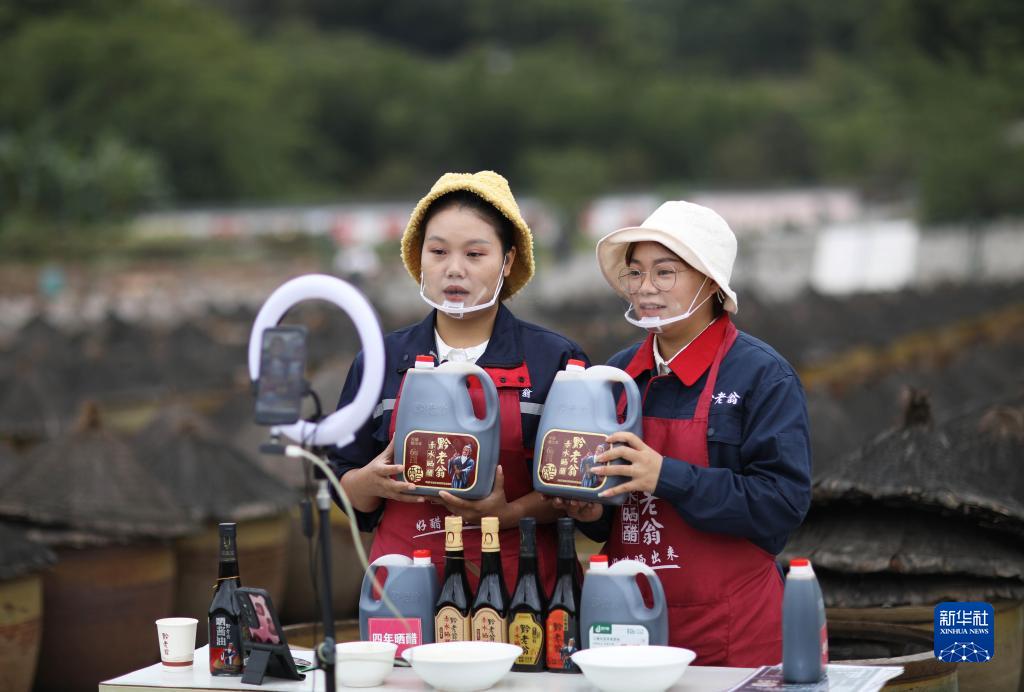 10月28日,在貴州省赤水市黔老翁醋廠(chǎng),主播通過(guò)網(wǎng)絡(luò )直播方式銷(xiāo)售曬醋。