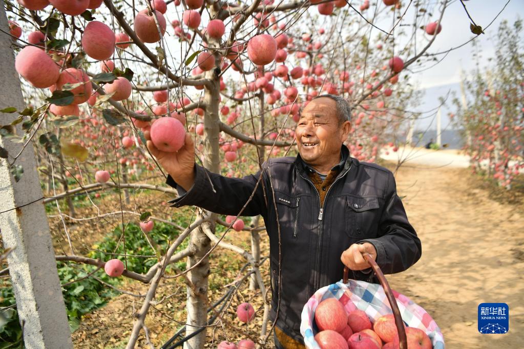 10月27日,在陜西省延安市安塞區南溝村,果農在果園采摘蘋(píng)果。 新華社記者 張博文 攝
