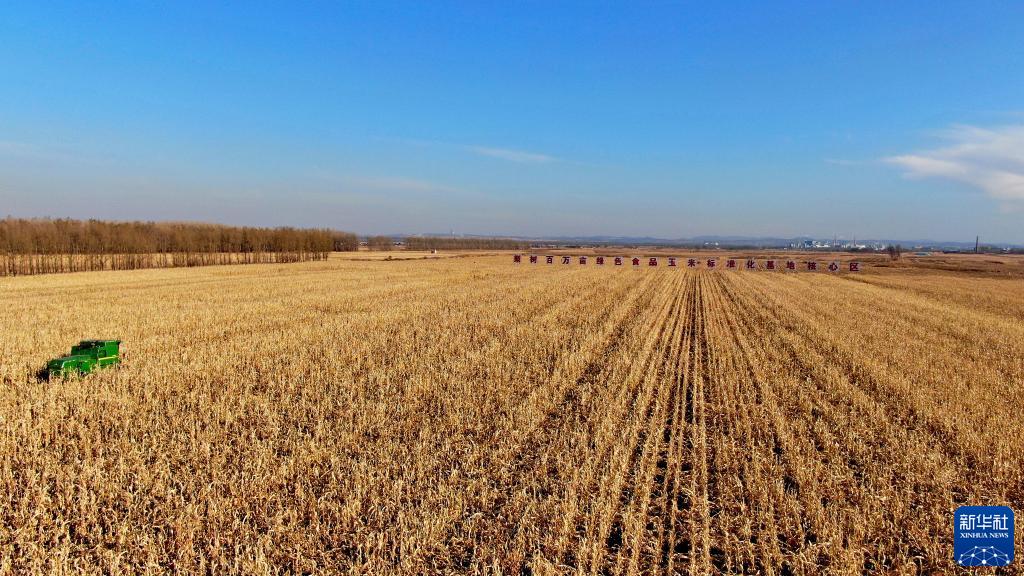在吉林省四平市梨樹(shù)縣國家百萬(wàn)畝綠色食品原料(玉米)標準化生產(chǎn)基地核心示范區,農民駕駛農機進(jìn)行秋收作業(yè)(10月28日攝,無(wú)人機照片)。