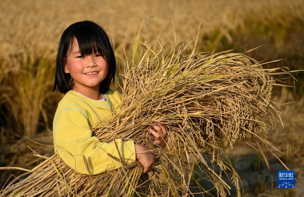 在陜西省西安市長(cháng)安區王曲街道皇甫村,一名兒童在稻田里懷抱稻谷(2022年10月21日攝)。
