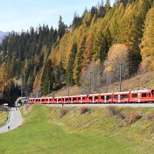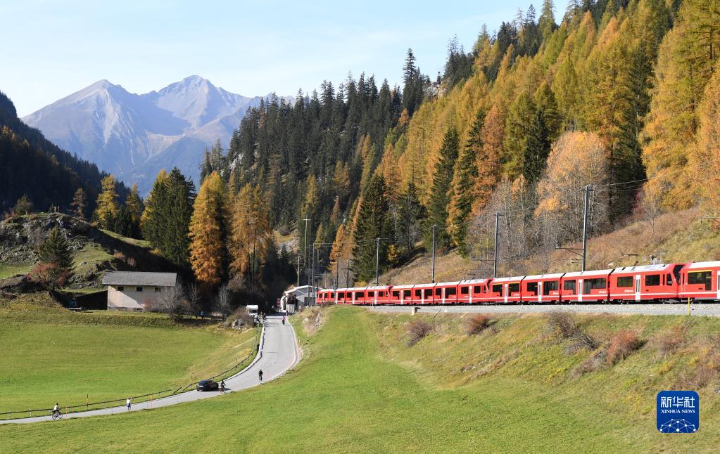 10月29日,世界最長(cháng)窄軌客運列車(chē)在位于瑞士阿爾卑斯山區的雷蒂亞鐵路網(wǎng)上行駛。