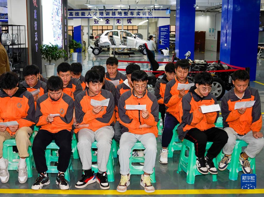 10月27日,重慶市黔江區民族職業(yè)教育中心的學(xué)生在汽車(chē)運用與維修實(shí)訓課上背誦知識要點(diǎn)。