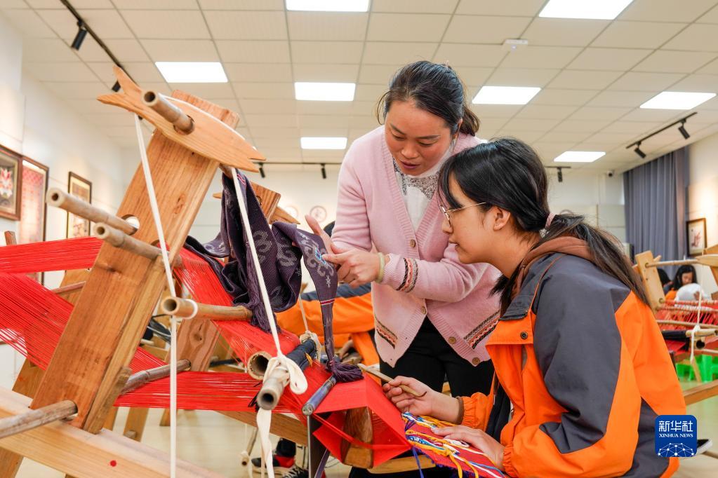 10月27日,重慶市黔江區民族職業(yè)教育中心的學(xué)生在老師(左)的指導下進(jìn)行西蘭卡普(土家語(yǔ),意為土花鋪蓋)織錦練習。