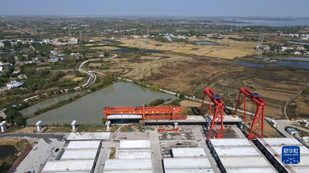這是中鐵四局合新鐵路安徽段站前七標箱梁架設現場(chǎng)(10月30日攝,無(wú)人機照片)。