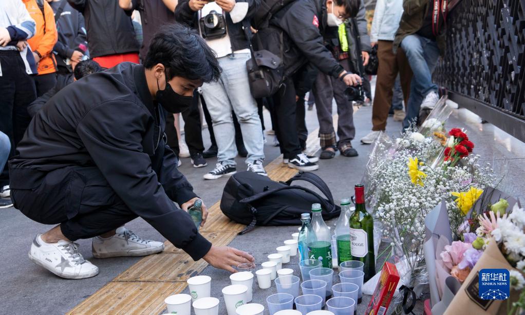 10月30日,民眾在韓國首爾市龍山區梨泰院洞一帶悼念踩踏事故遇難者。