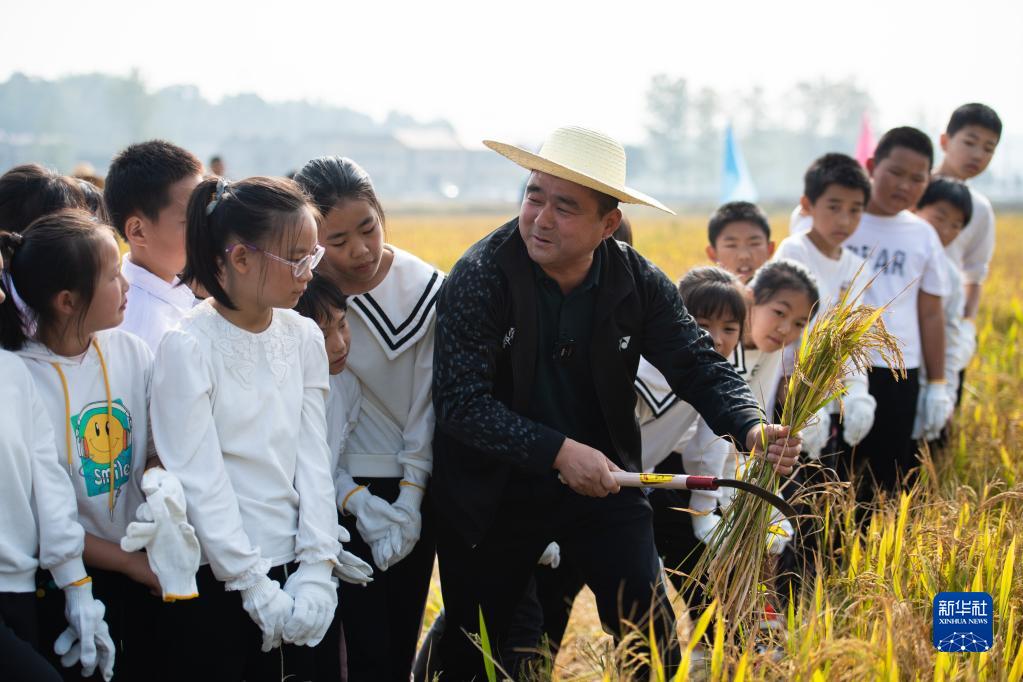 秋收時(shí)節,湖南省常德市桃源縣寺坪中學(xué)在農田開(kāi)展“田間課堂”活動(dòng),學(xué)生們體驗收割水稻、觀(guān)看農機作業(yè),學(xué)習糧食相關(guān)知識,感受勞動(dòng)的艱辛和豐收的喜悅。