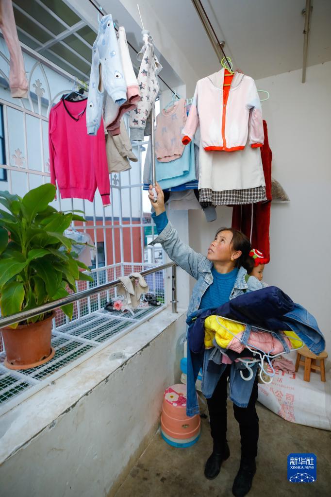 10月28日,在四川省涼山州越西縣越城鎮城北感恩社區,易地扶貧搬遷到此的沙馬石各在陽(yáng)臺上收洗好的衣服,搬進(jìn)樓房后她也用上了洗衣機。