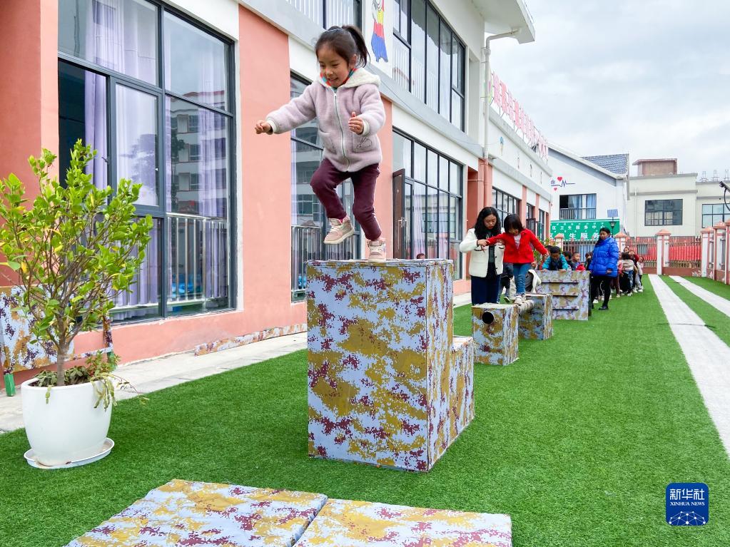 10月28日,在四川省涼山州越西縣越城鎮城北感恩社區的越西縣越城鎮第一幼兒園,隨家人易地扶貧搬遷到此的孩子們在老師的陪伴下玩耍。