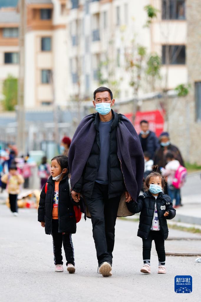 10月27日,在四川省涼山州昭覺(jué)縣南坪社區幼兒園外,易地扶貧搬遷到此的居民接放學(xué)的孩子回家。幼兒園就在家附近,孩子們上學(xué)很方便。