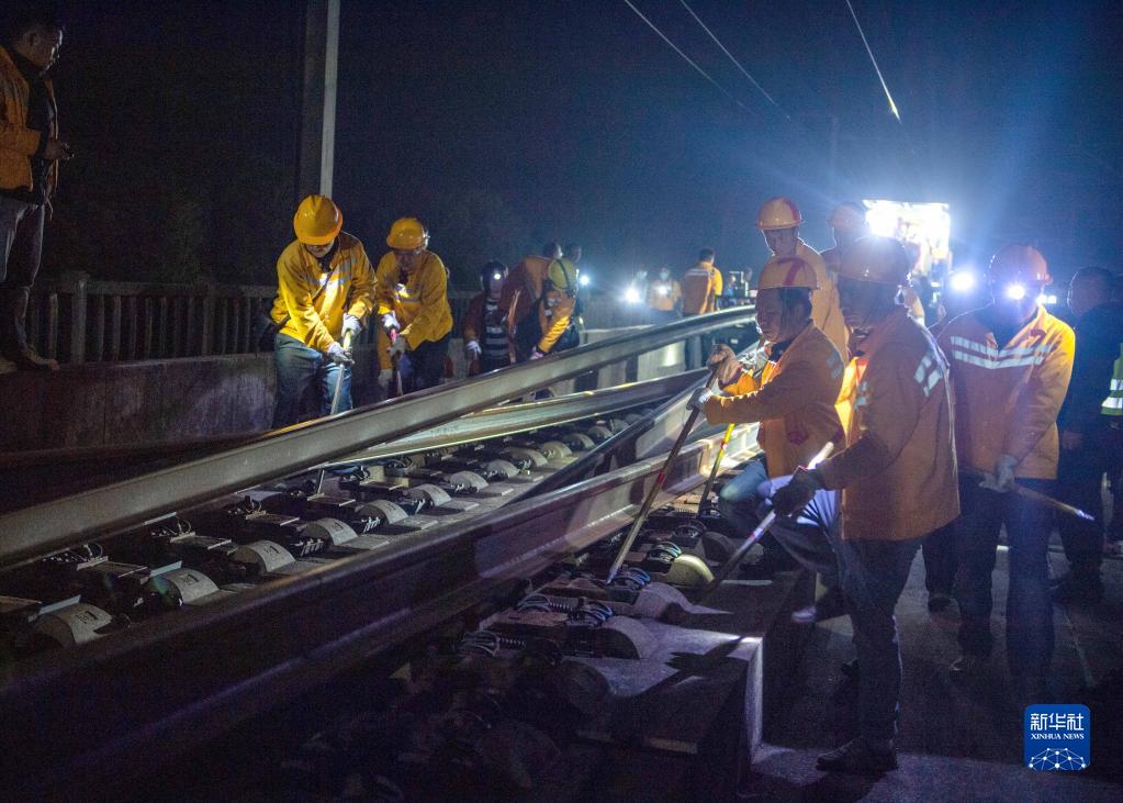 11月2日凌晨,鐵路工人在京廣高鐵株洲西至衡山西區間進(jìn)行換軌施工。