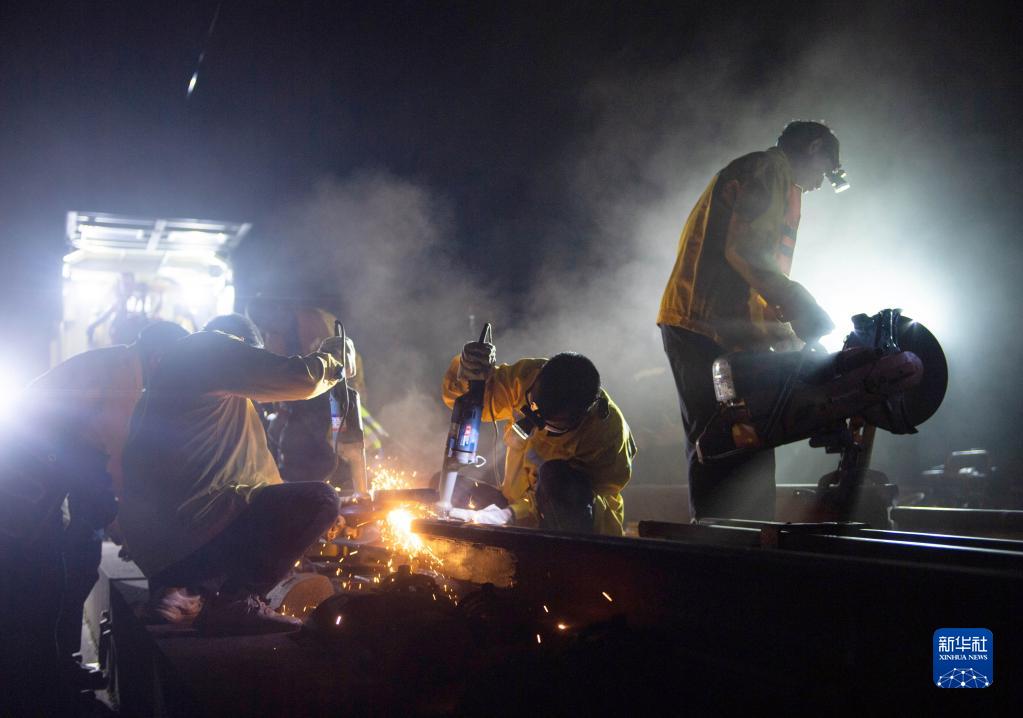 11月2日凌晨,鐵路工人在京廣高鐵株洲西至衡山西區間進(jìn)行換軌施工。