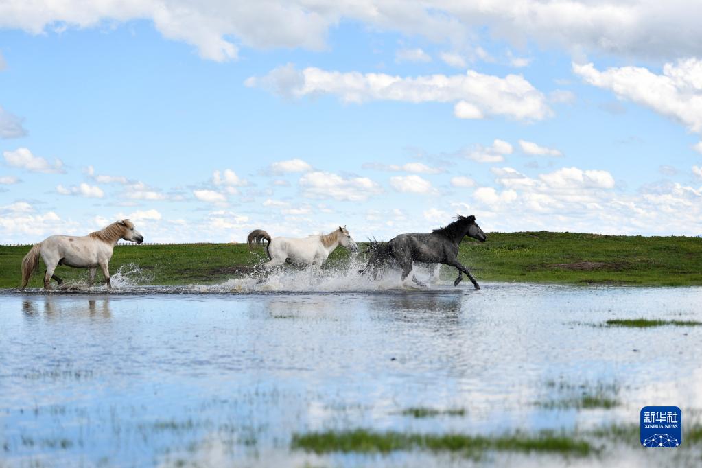 河曲馬在甘肅省甘南藏族自治州瑪曲縣河曲馬場(chǎng)的濕地奔跑(2019年6月22日攝)。