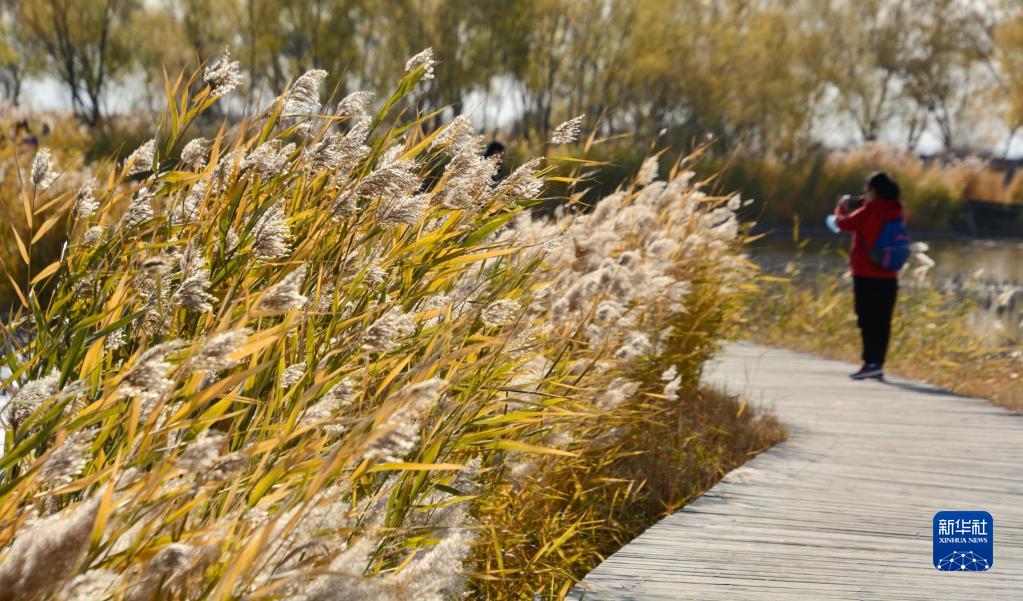 游人在北京野鴨湖國家濕地公園內賞秋(11月1日攝)。