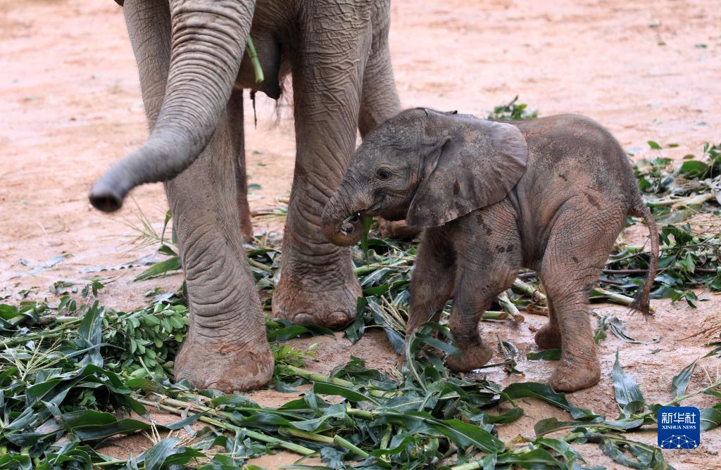 11月3日,新生非洲象寶寶在媽媽陪伴下玩耍。