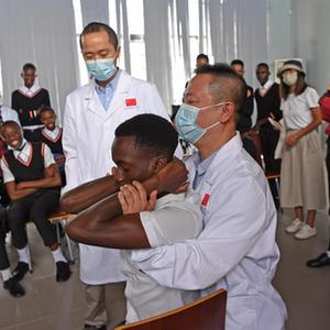 在納米比亞首都溫得和克的毛澤東主席中學(xué)3日的中文課上,第十四批中國援納醫療隊用銀針、火罐作教具,以推拿、做操為內容,讓同學(xué)們在輕松愉悅的學(xué)習中體驗中國傳統醫學(xué)文化。