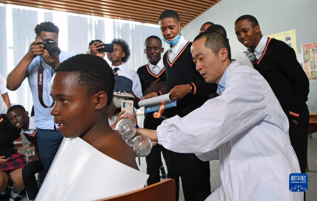 11月3日,在納米比亞首都溫得和克的毛澤東主席中學(xué),中國援納醫療隊醫生為學(xué)生演示拔火罐。